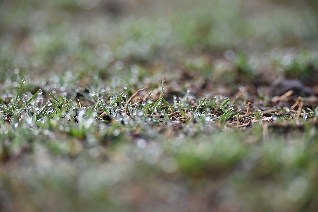 雨上がりの朝です。芝はぬれていますが、ぬかるみ等はありません。